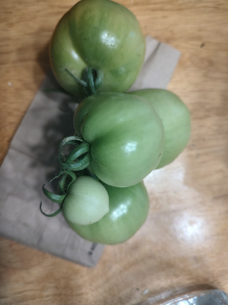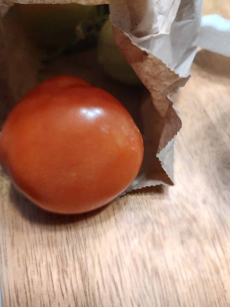 Close the bag (we fold/tuck the top) and be patient. Apparently gas from the ripening tomatoes stimulates the other tomatoes to ripen. What a sustainable process!
