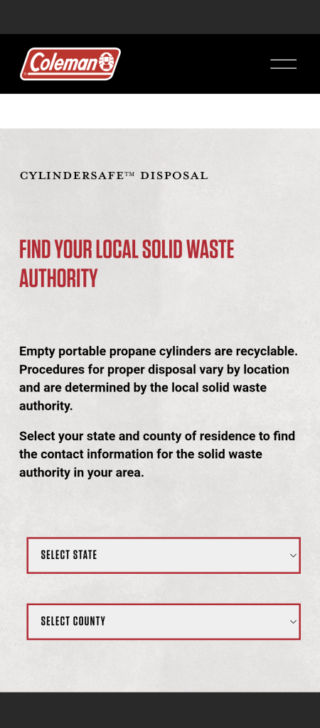 So, imagine my surprise when I visited the Coleman company‘s website and learned that a Coleman propane can recycling program DOES NOT EXIST. They outsource the manufacture of Coleman-branded propane and that manufacturer has not created an exchange program either. So, consumers of their propane camping products—nature lovers, mind you—are directed to discard empty steel containers as local hazardous waste. Coleman does NOT take responsibility for their product life cycle (extraction of raw materials, production, use, and post-use phases). But they are not the only choice in the supplier pool.